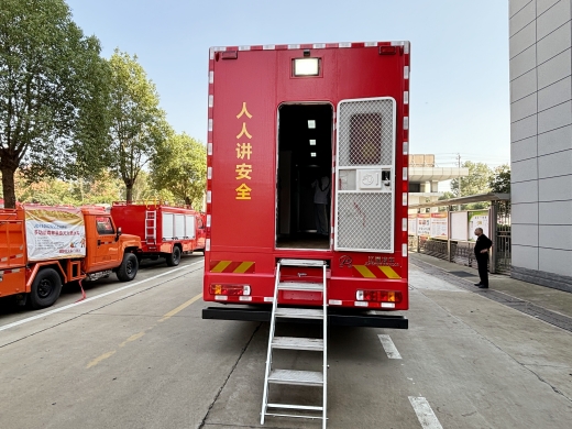 2.車(chē)輛性能參數(shù):這款車(chē)整體車(chē)身以大紅色為背景色,噴繪消防標(biāo)識(shí)等圖文,色彩鮮艷奪目,具有很強(qiáng)的吸引力;集紅外線(xiàn)探測(cè)器、火災(zāi)報(bào)警器、實(shí)景電梯按鈕、發(fā)煙裝置、模擬火焰等聲光電裝置于一體。箱體長(zhǎng)8.2米、寬2.5米、高3.9米,載重18噸,集宣傳、演示、演練、體驗(yàn)等多功能于一體。該車(chē)采用金標(biāo)汕德卡車(chē)底盤(pán),可通過(guò)手持ipad無(wú)線(xiàn)遙控,也可以通過(guò)車(chē)載控制設(shè)備控制車(chē)身變形。依托車(chē)上的箱體,打造了一個(gè)40平方米的火場(chǎng)逃生體驗(yàn)室,逼真地模擬火災(zāi)現(xiàn)場(chǎng)。大屏上還裝有一套內(nèi)置的119模擬報(bào)警程序,掃描二維碼安裝該體驗(yàn)程序后,即可體驗(yàn)?zāi)M火災(zāi)和模擬報(bào)警。