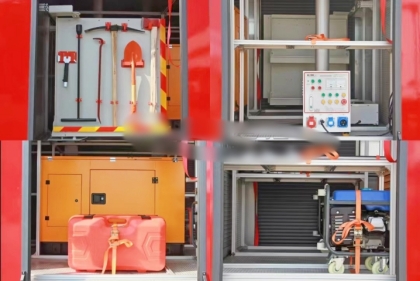 駕駛室頂部前端為長排警燈,車身后配有24V/60W火場照明燈一只,車輛兩側(cè)上方各配有紅藍相配的爆閃燈,下方安裝安全標志燈,乘員室、器材箱、 泵房內(nèi)均裝有照明燈,加裝有100W警報器,回轉(zhuǎn)警燈開關(guān)、通訊設(shè)備預(yù)備接口。