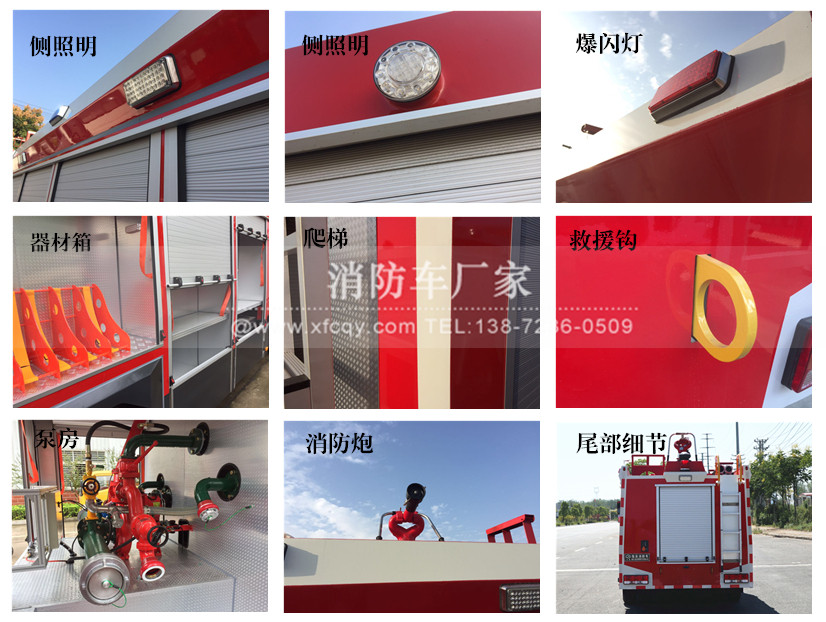 駕駛室頂部前端為長排警燈,車身后配有24V/60W火場照明燈一只,車輛兩側(cè)上方各配有紅藍(lán)相配的爆閃燈,下方安裝安全標(biāo)志燈,乘員室、器材箱、 泵房內(nèi)均裝有照明燈,加裝有100W警報器,回轉(zhuǎn)警燈開關(guān)、通訊設(shè)備預(yù)備接口。